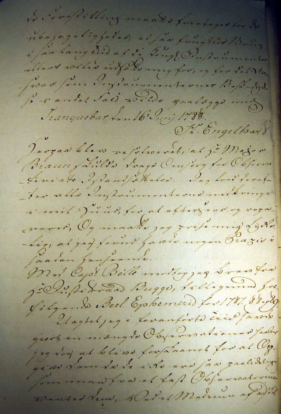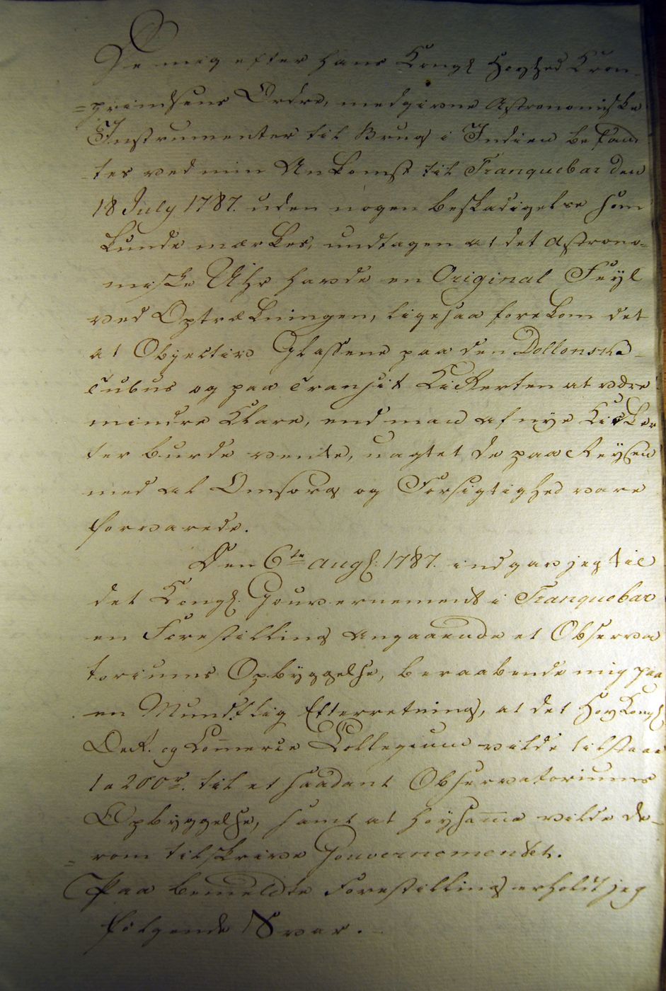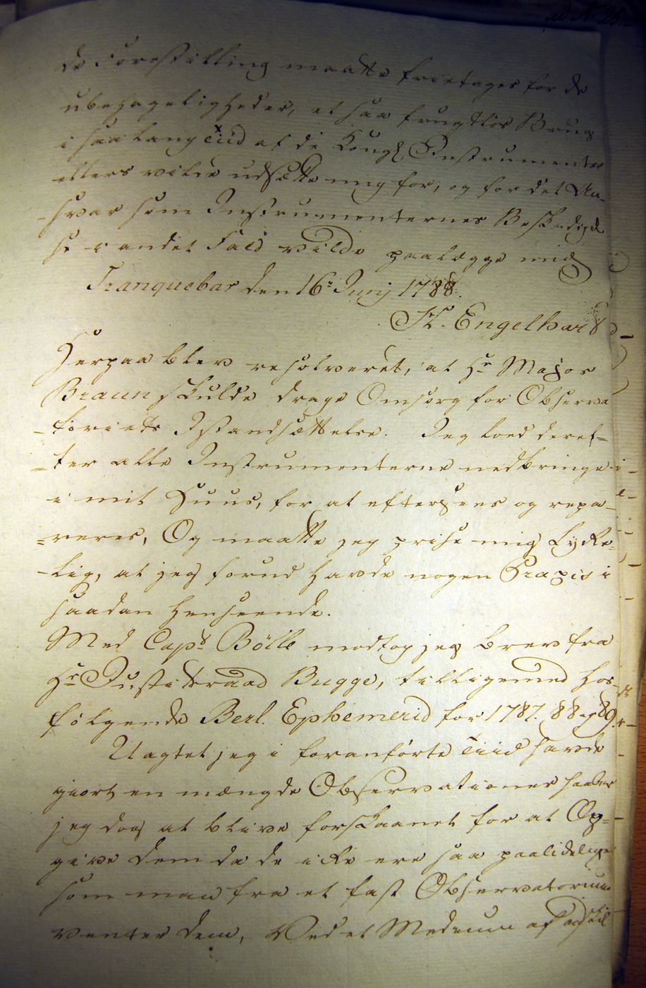 Henning Munch EngelhartHenning Munch Engelhart (also known as Engelhardt) must truly rate as an unsung hero during the Danish colonisation period. He was born in Rendalen in Norway in 1757. After studying at the Latin School in Christiania (today's Oslo), he took a degree in Theology from the University of Copenhagen. He was also proficient in mathematics, astronomy and geography. He came to Tranquebar as a ship's parson in 1784. He was put in charge of registering all the Danish archive materials in Tranquebar. With the help of his professor in astronomy, Thomas Bugge, he brought several astronomical instruments to Tranquebar and established an astronomical observatory in the tower of the Zion's Church. The instruments that he established at the observatory were a 2' astronomical circle, a transit instrument with a 3' astronomical telescope, an astronomical clock, a 2' telescope with 2 objectives and a 8' Dollond telescope. The observatory was finished sometime in 1788. During 1788 and 1789, Engelhardt measured the latitude and longitude of Tranquebar. He measured the latitude to be 11° 1' 20" N. The modern value is 11° 1' 34" N!. He also measured the time difference between Tranquebar and Greenwich through an observation of Jupiter's satellites (and a comparison with the Nautical Almanac from Britian) to be 5 h 18' 58" whereeas the true value today is 5 h 19' 25"! John Goldingham who is supposed to have established the astronomical observatory in Madras, published in 1822 an article in the Philosophical Transactions of the Royal Society in which he ascribed wrongly the measurement of the longitude of Tranquebar to Topping. Engelhardt started an association called "The Tranquebar Association for knowledge on India"; only one partial proceeding of the association exists. This contains articles by C. S. John on a proposal to establish a botanical garden in Tranquebar, on different snakes in and around Tranquebar. There is also an article from Engelhardt on the construction of the astronomical observatory: " The height of the tower from the ground to the floor of the observatory is 40 feet, and the thickness of the walls is 3’. One climbs up to the balcony of the Zion church, and a flight of stairs with 22 steps leads to the observatory, which has a gallery on one side. The tower is in the form of a rectangle 13 ½’ in length and 12’ in breadth. The inside length of the observatory is 11 ½’, and is 10’ broad...". Engelhardt also had written "A history of the Danish East Indian Establishments" which has not been published, and is in a manuscript form. Already during January 1791, he was sent to the Nicobars to make a survey of the Islands (called |