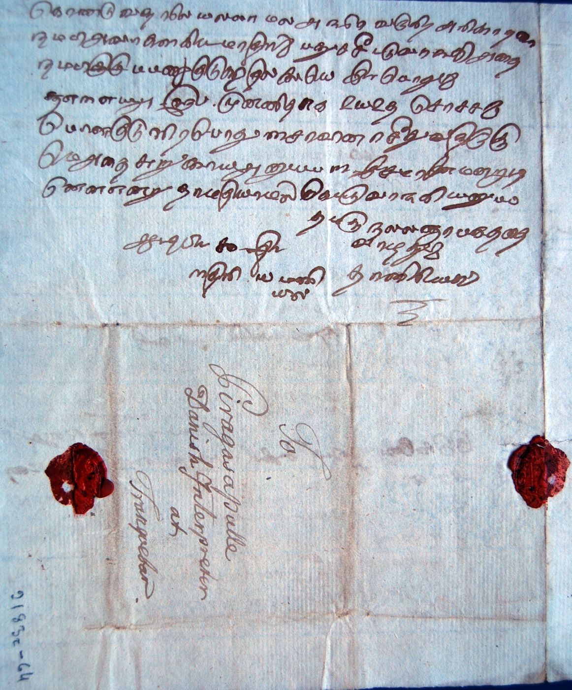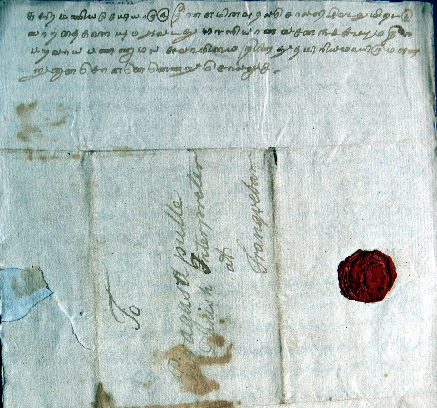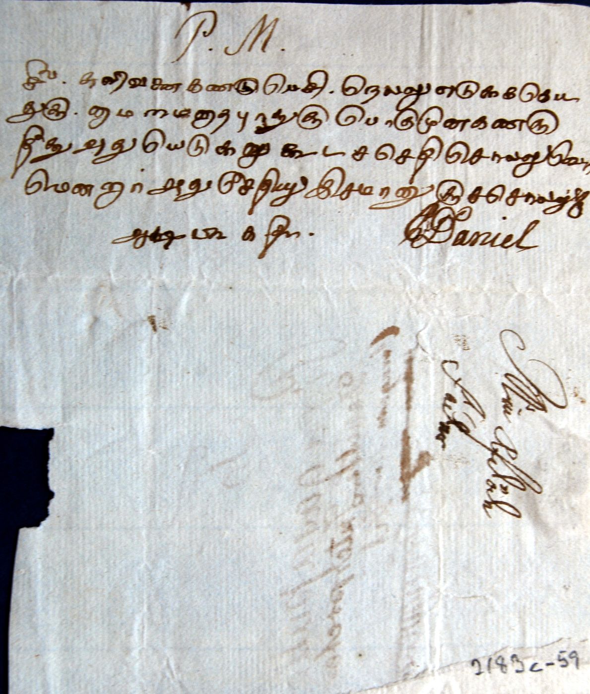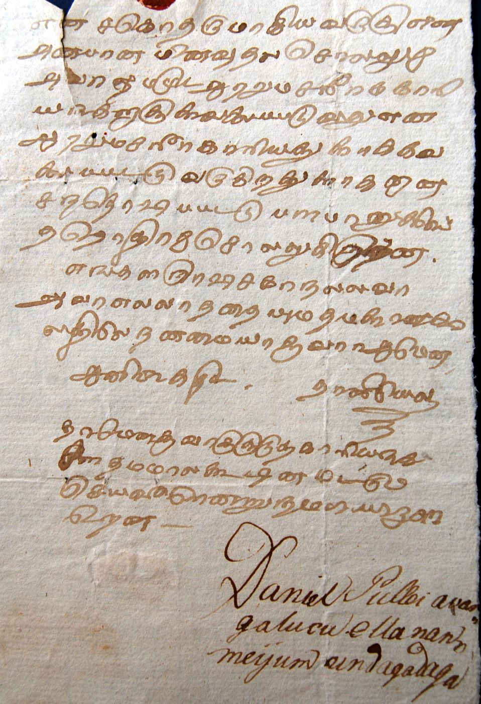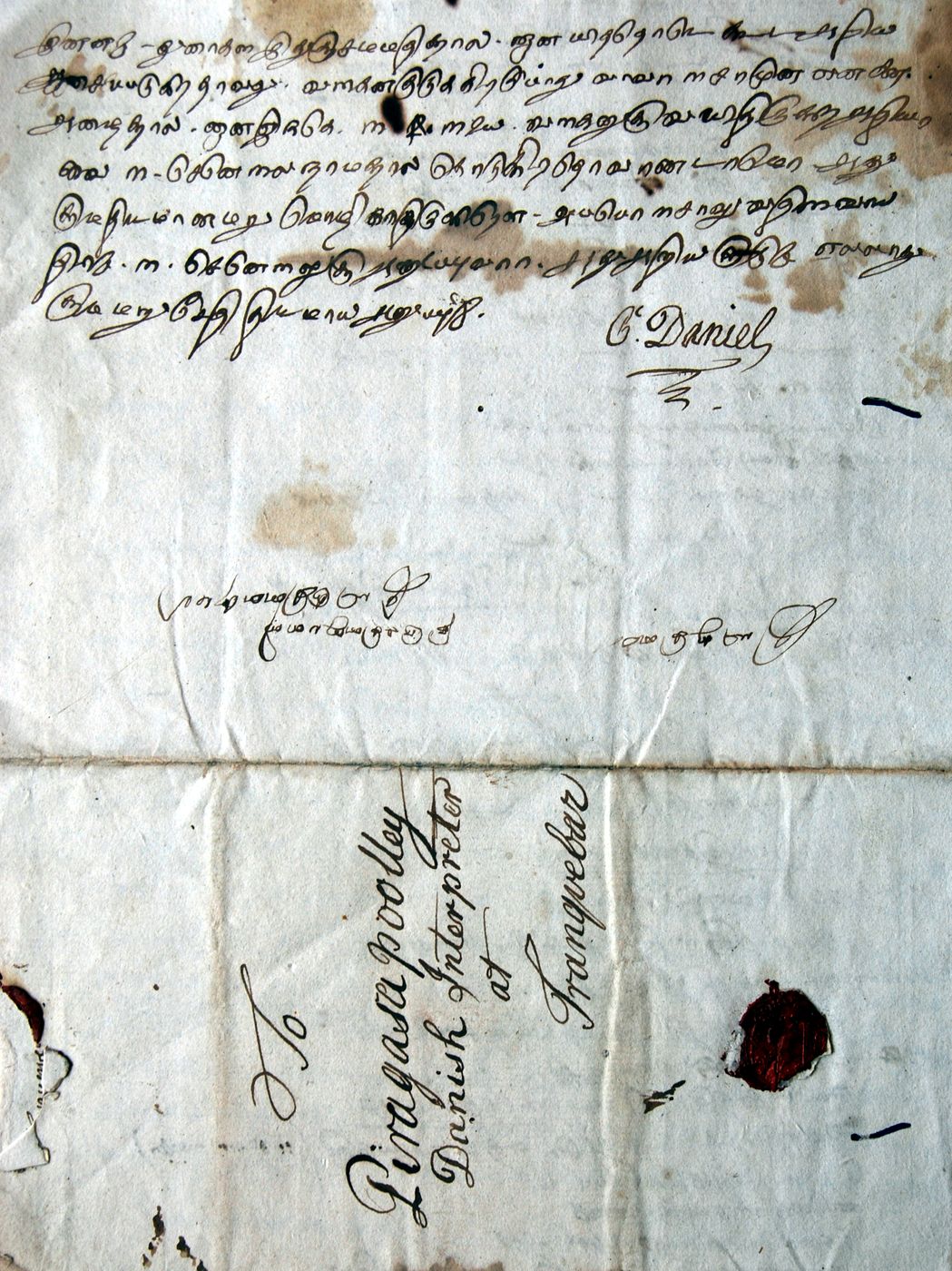 Daniel PulleyDaniel Pulley was born in 1740. He is also referred to as Christian Daniel. His grandfather, Johann d’Almeida (Heike Liebau) had converted from Catholicism to Protestantism and was a catechist at Tranquebar between 1707 and 1744. We know little about Daniel’s parents, except that they were Protestants. Daniel’s father died early and he was brought up by his grandfather on mother’s side. Johann d’ Almeida died in 1746. As a young man, Daniel learnt German and used every opportunity to learn more of it. From 1755, he taught Tamil to the missionaries David Poltzenhagen (1726-1756), Petrus Dame (1731-1766) and Ole Maderup (1711-1776). Besides German, he also learnt Danish. He undertook the post of the second translator (dubash) at the instigation of H. J. Forck. Daniel’s brother, Peter Rajappan was employed in the Danish Halle Mission, and later in the Moravian Brothers (Herrnhuter)A large number of the letters in the Archives are addressed to Piragasam Pulley, a personal dubash to the Governor. The letters cover the period 1782-1785? Most of the letters are dated only with the Tamil month and the Tamil date, and no year. The letters reflect his respect and affection to Piragasam Pulley. However, this situation changed in 1788, and in 1792 Daniel Pulley was decidedly unfriendly to Piragasam Pulley, and to the new governor, Peter Anker. One of the reasons quoted is that Daniel himself wanted the powerful position of the over-dubash, and thus more power. The life-story of Daniel Pulley may never have been known, but for the fact that he had narrated his autobiography to C. S. John, a missionary. C. S. John had sent this information to the Frankesche Stiftungen at Halle, where they are preserved. C. S. John reported that Daniel Pulley died during 1802. However, the proceedings of the Black Court (see 2185b_42under Black Court) seems to have recorded during 1805 that a case was adjourned as Daniel Pulley did not turn up. This probably was Johan Daniel Pulley, the son of Christian Daniel Pulley. . |