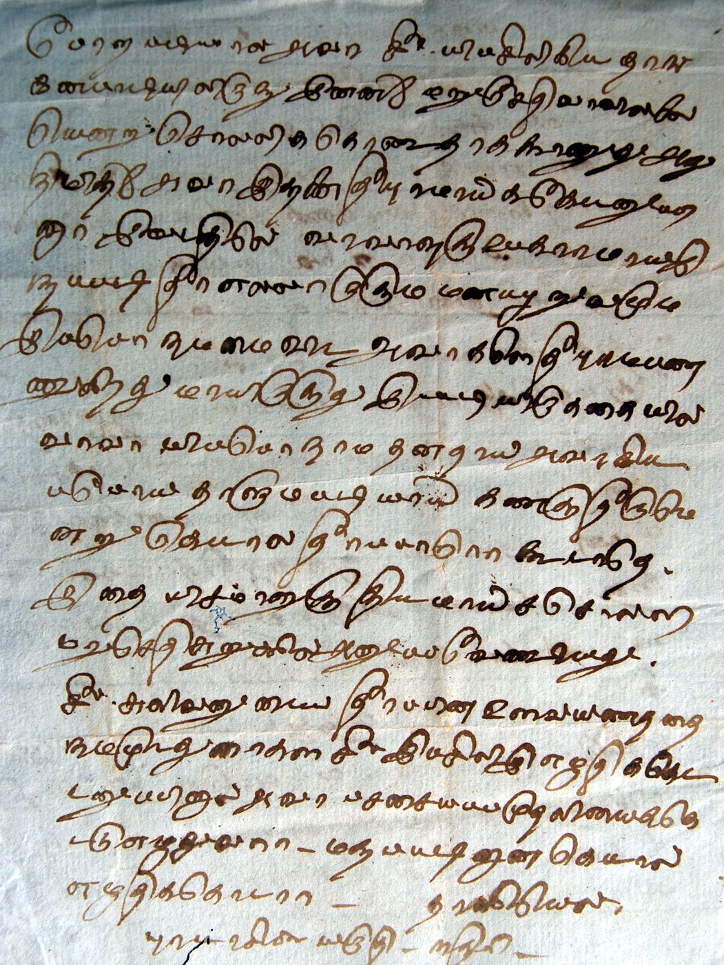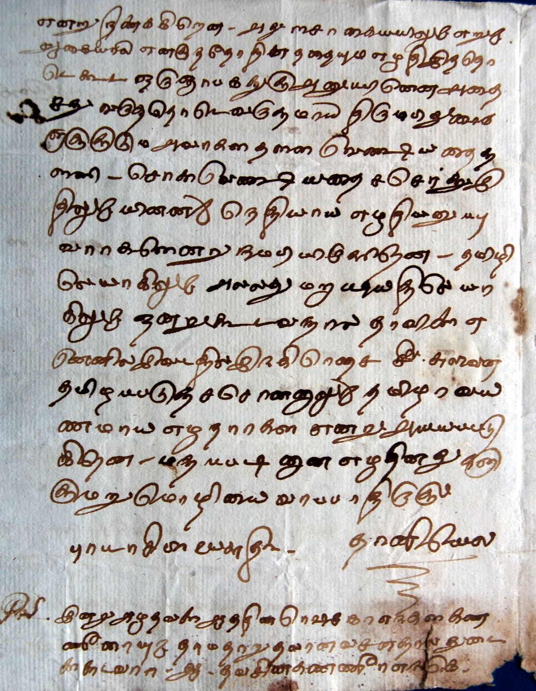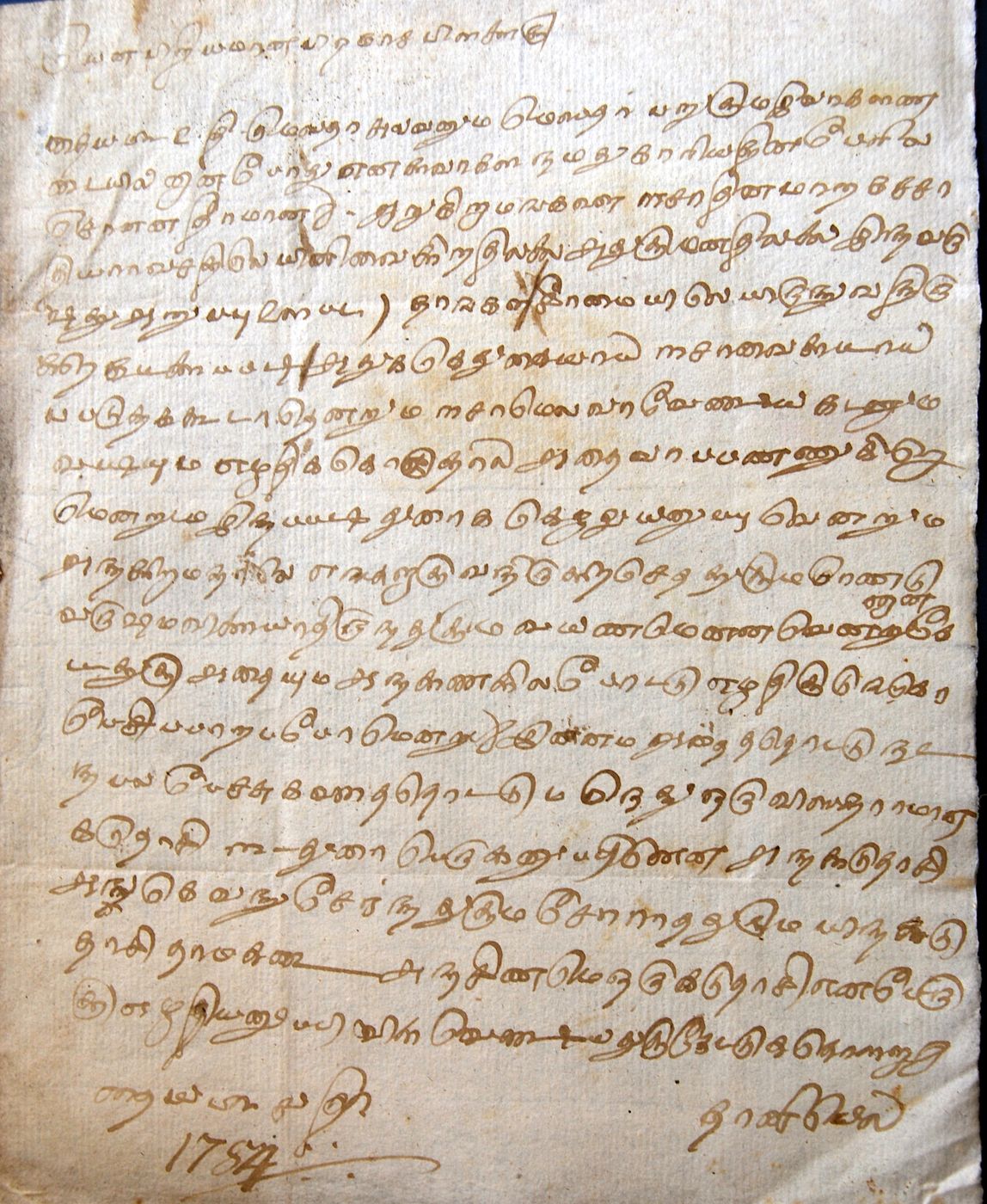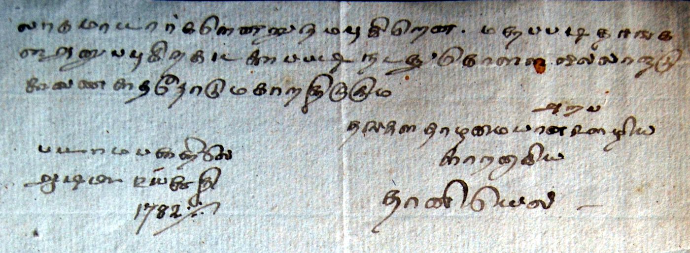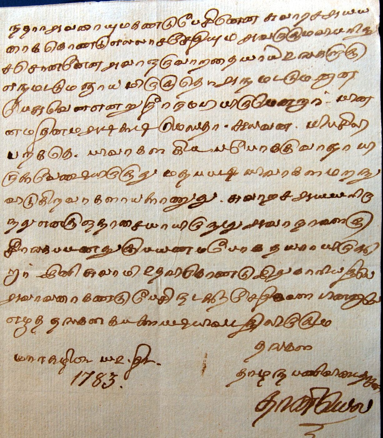 Daniel PulleyDaniel Pulley was born in 1740. He is also referred to as Christian Daniel. His grandfather, Johann d’Almeida (Heike Liebau) had converted from Catholicism to Protestantism and was a catechist at Tranquebar between 1707 and 1744. We know little about Daniel’s parents, except that they were Protestants. Daniel’s father died early and he was brought up by his grandfather on mother’s side. Johann d’ Almeida died in 1746. As a young man, Daniel learnt German and used every opportunity to learn more of it. From 1755, he taught Tamil to the missionaries David Poltzenhagen (1726-1756), Petrus Dame (1731-1766) and Ole Maderup (1711-1776). Besides German, he also learnt Danish. He undertook the post of the second translator (dubash) at the instigation of H. J. Forck. Daniel’s brother, Peter Rajappan was employed in the Danish Halle Mission, and later in the Moravian Brothers (Herrnhuter)A large number of the letters in the Archives are addressed to Piragasam Pulley, a personal dubash to the Governor. The letters cover the period 1782-1785? Most of the letters are dated only with the Tamil month and the Tamil date, and no year. The letters reflect his respect and affection to Piragasam Pulley. However, this situation changed in 1788, and in 1792 Daniel Pulley was decidedly unfriendly to Piragasam Pulley, and to the new governor, Peter Anker. One of the reasons quoted is that Daniel himself wanted the powerful position of the over-dubash, and thus more power. The life-story of Daniel Pulley may never have been known, but for the fact that he had narrated his autobiography to C. S. John, a missionary. C. S. John had sent this information to the Frankesche Stiftungen at Halle, where they are preserved. C. S. John reported that Daniel Pulley died during 1802. However, the proceedings of the Black Court (see 2185b_42under Black Court) seems to have recorded during 1805 that a case was adjourned as Daniel Pulley did not turn up. This probably was Johan Daniel Pulley, the son of Christian Daniel Pulley. . |