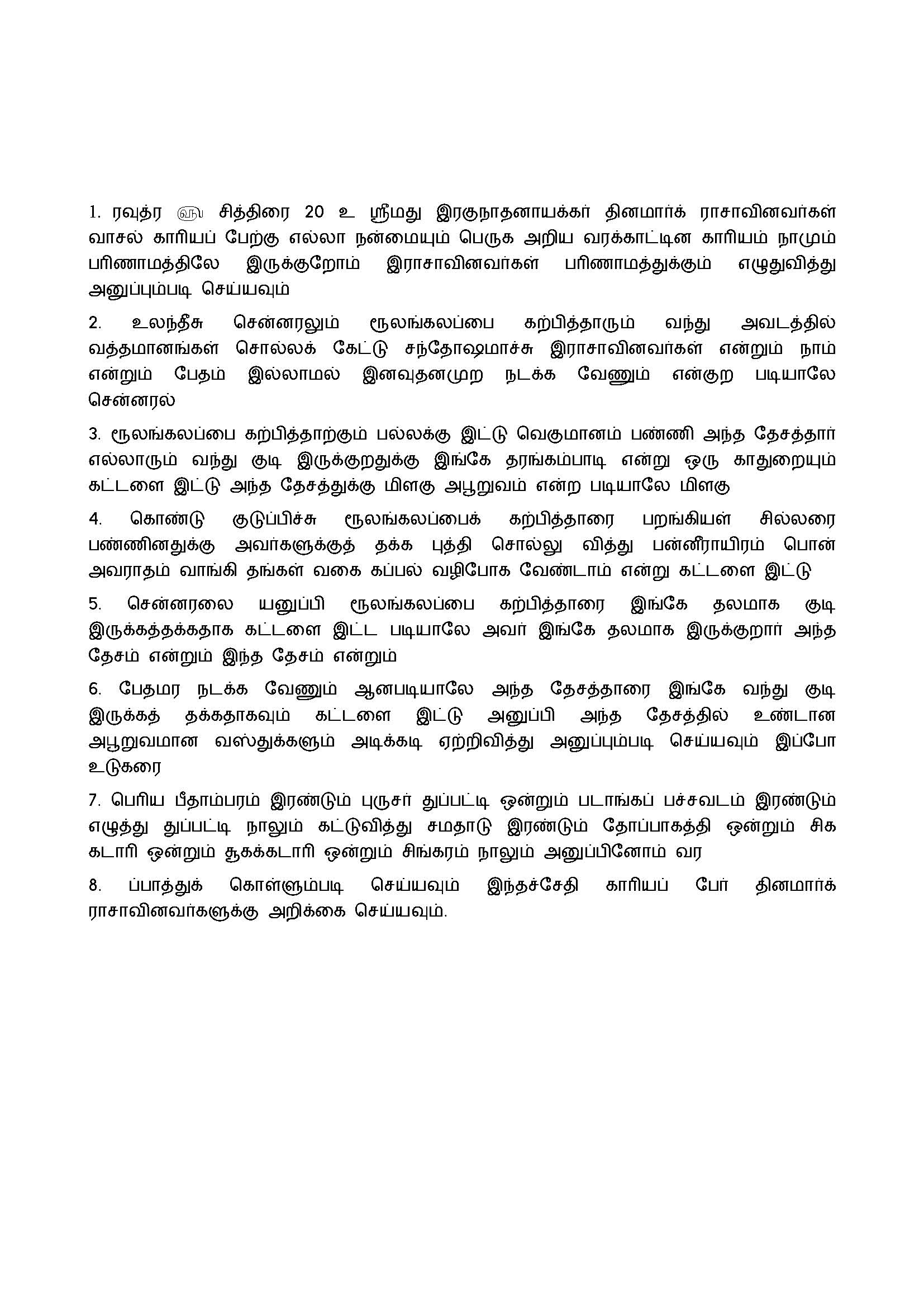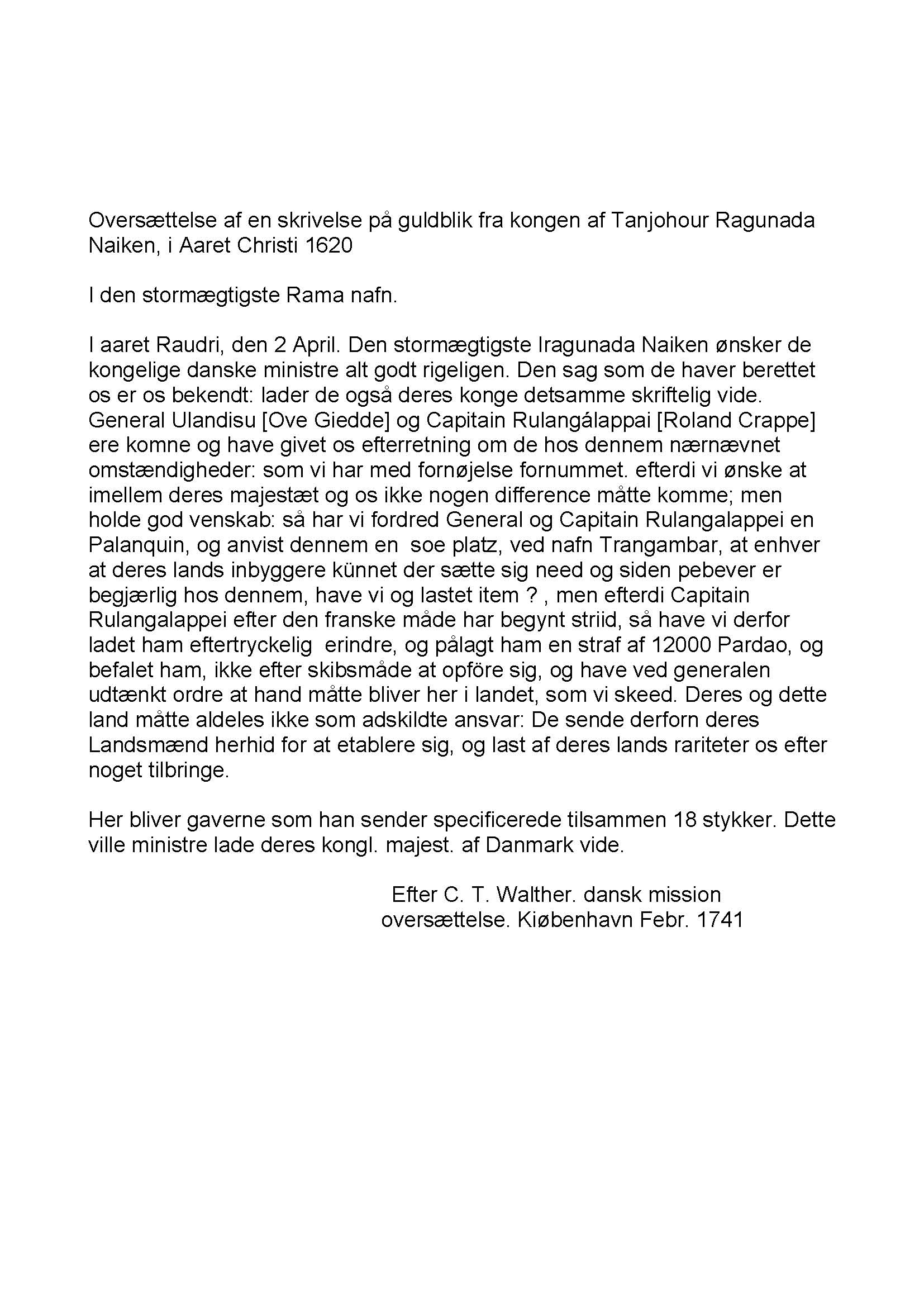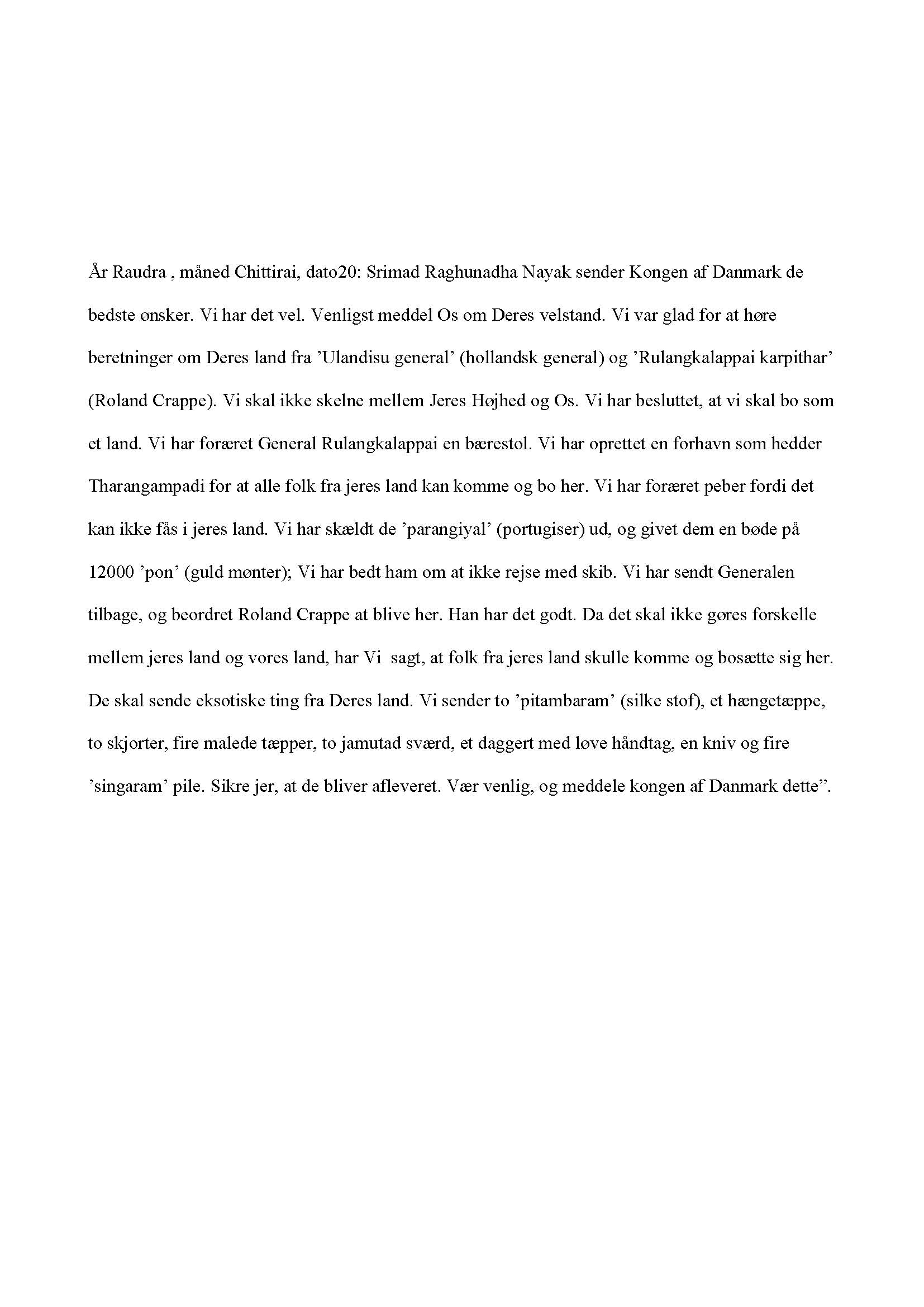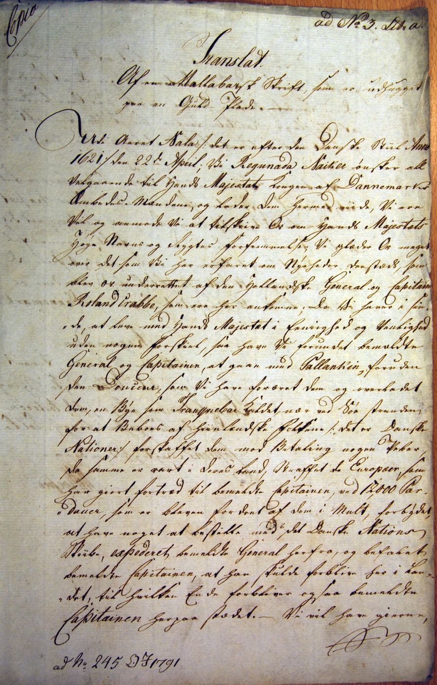 Gold FoilIn 1620, a letter on a gold foil 40 cm long and 25 mm wide, was written announcing the establishment of a port by name Tharangampadi, and inviting Danes to settle there. The foil was signed by Raghunatha Nayak in Telugu. The text of the letter is in Tamil. The text was translated into Danish and German by C. T. Walther in 1741. In 1987, Nagaswamy made a transcription of the foil as well as made a translation, which was published in a booklet "Tarangambadi" published in honour of the visit by the then Danish Prime Minister, Poul Schlüter to Tranquebar. I have had the opportunity to photograph the foil during 2008, and an image is shown below. I also reproduce the Tamil text of the foil, as well as the translation by C. T. Walther. There are a number of differences between Walther's and Nagaswamy's as well as mine. One can see the signature of the Nayak on the lower right hand side of the foil. The signature sprawls across several text lines, which surround the signature. This seems to indicate that Raghunatha Nayak had signed first, and the text was filled up later. The signature of the Nayak can be compared with the signature on the final treaty between him and Ove Gedde, reproduced under "Treaties". The text of the foil starts with "Raudra year, Chittirai month, 20th"; This will correspond to the current Gregorian date of April 25, 1620 ("Indian Chronology", L. D. Swamikannu Pillai). At this time, Ove Gedde was still around Africa's Horn, and had not yet reached Ceylon. The second line of the text starts with "ulandeesu chenneralum, Rulangkalappai karpitharum.."; Rulangkalappai refers to Roeland Crappe and karpithar is Captain. Ulandeesu Chennaral refers to a General from Holland. Who this General was, we do not know. Walther translated the date as: "Raudra 2nd April". Later citations claim this date to be "2nd April 1621" and these cannot be correct. Walther also translated Ulandeesu as Ove Gedde! It is obvious from the text that Tranquebar was given to the Danes, but through Roeland Crappe. The text states that a port called Tharangampadi has been established with a view to Danes settling there. Historians of the later period have misinterpreted the contents of the golden foil as THE treaty written in Tamil (see under Peder Hansen). It is not - it is a letter of friendship written by the Nayak. In the National Archives (RA), there is another translation of the gold foil from 1791, which has been overlooked by all historians (Ostindiske journalsager, Pakke 1004 (1791), #245). Daniel Pulley and Piragasam Pulley attest to the correctness of the translation. This translation is accurate, with the exception of the year which is mentioned as Nala. Nala corresponds to 1616! Apart from this, the rest of text corresponds to my recent translation. |