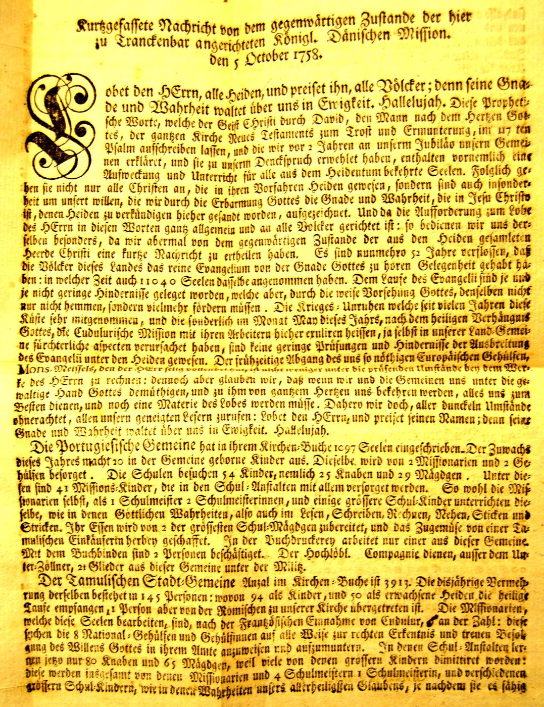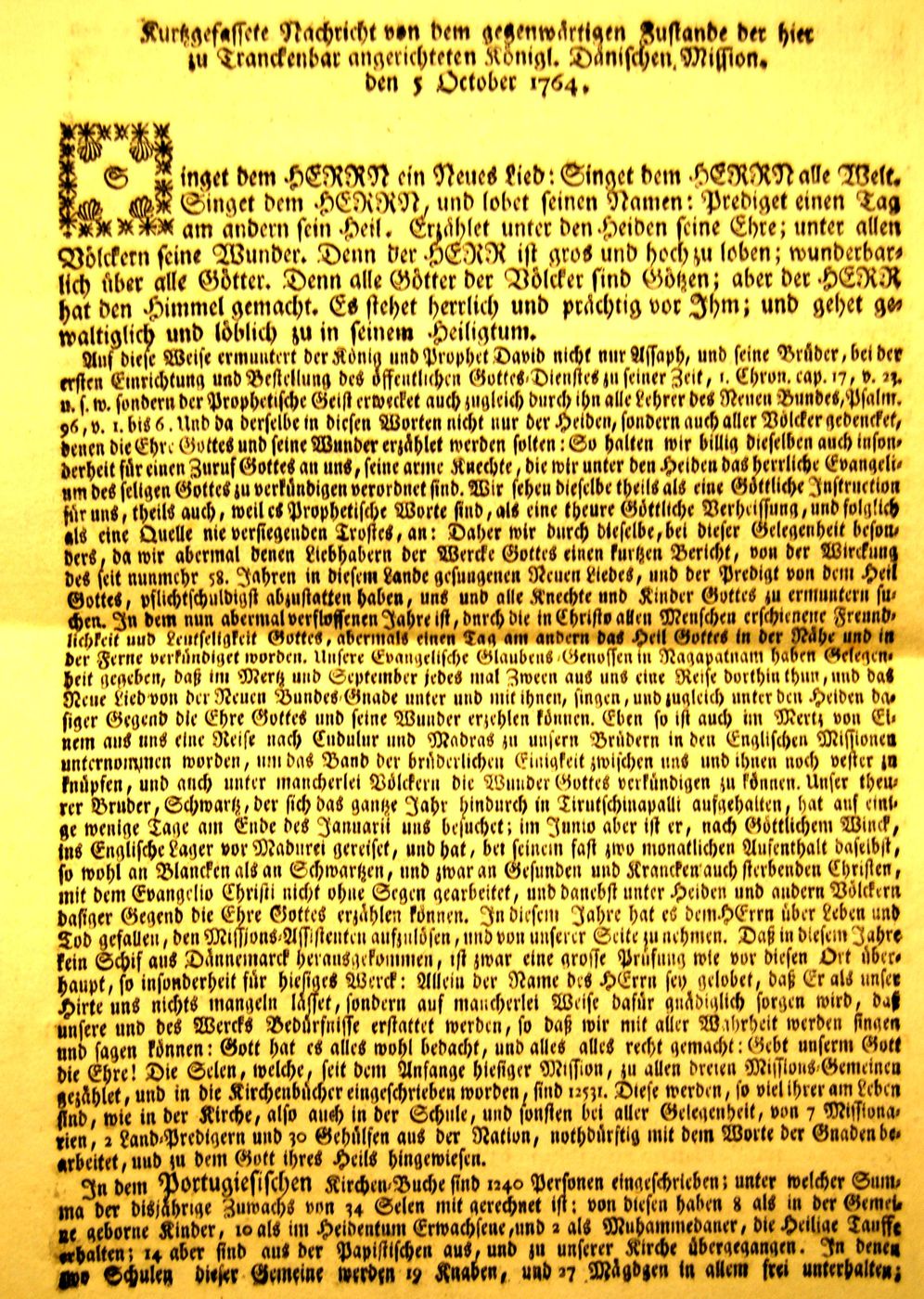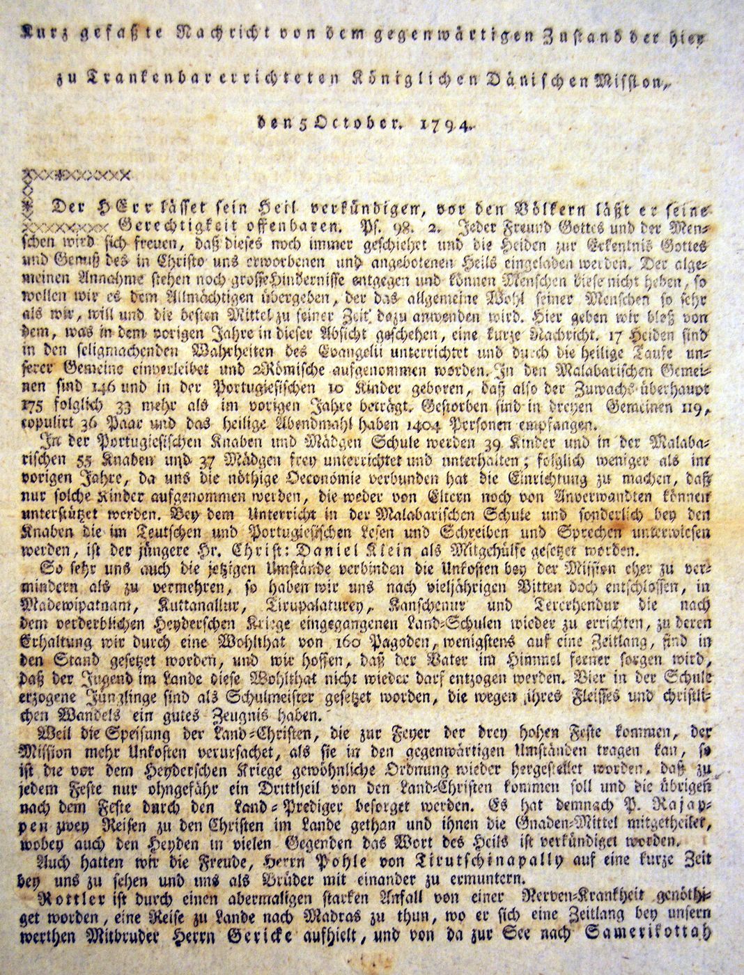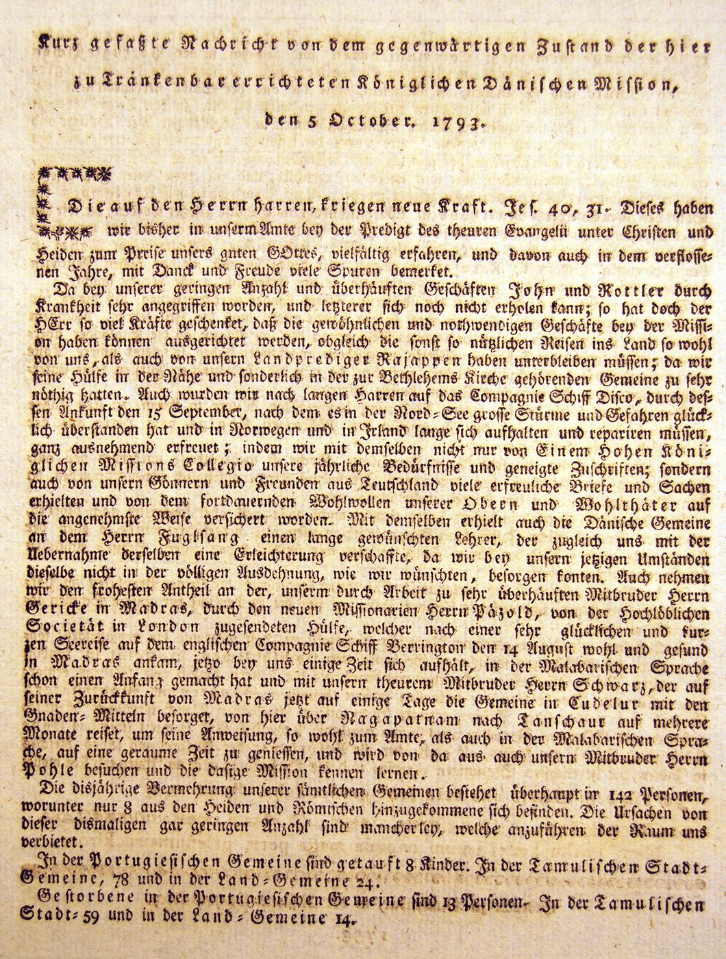 . MissionFrederik IV (1671-1730) was responsible for the evangelical missionary activity in Tranquebar. After contemplating for several years, he decided to sent evangelical messengers to Tranquebar. In 1704, he approached Dr. Lütkens about the possibility of finding suitable messengers. Lütkens, in turn, consulted Prof. Francke of Halle, Germany which resulted in two young missionaries, Bartholomäus Ziegenbalg and Heinrich Plütschau arriving at Tranquebar in 1706. Several missionaries from Germany at the behest of the Halle Mission during the next decades. They included people such as Gründler, Schultze, Schwartz, Gericke, John and Cämmerer. The history of the Tranquebar Mission has been elaborately chronicled by Ferd. Fenger ("History of the Tranquebar Mission", printed by Evangelical Lutheran Mission press, available as a Google book: books.google.dk). Other important works in this area include "Bartholomaus Ziegenbalg: the father of modern Protestant mission" and "Inkulturation in Tranquebar: Der Beitrag der fruhen Danisch-Halleschen Mission zum Werden einer Indisch-Einheimnischen Kirche (1706-1730)" by Daniel Jeyaraj. There are also several articles and book-chapters by Heike Liebau. Printed Mission reports in Gothic German covering the period 1751-1796 from the National Archives, Copenhagen as well as a few letters in Tamil by Aaron and Diogo are shown in this page. |