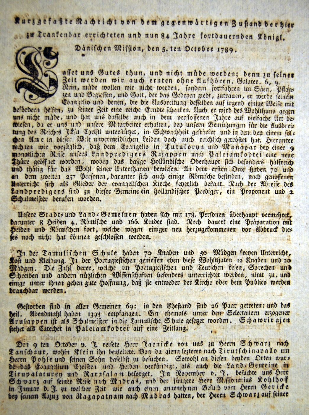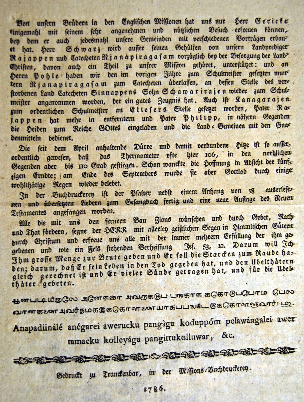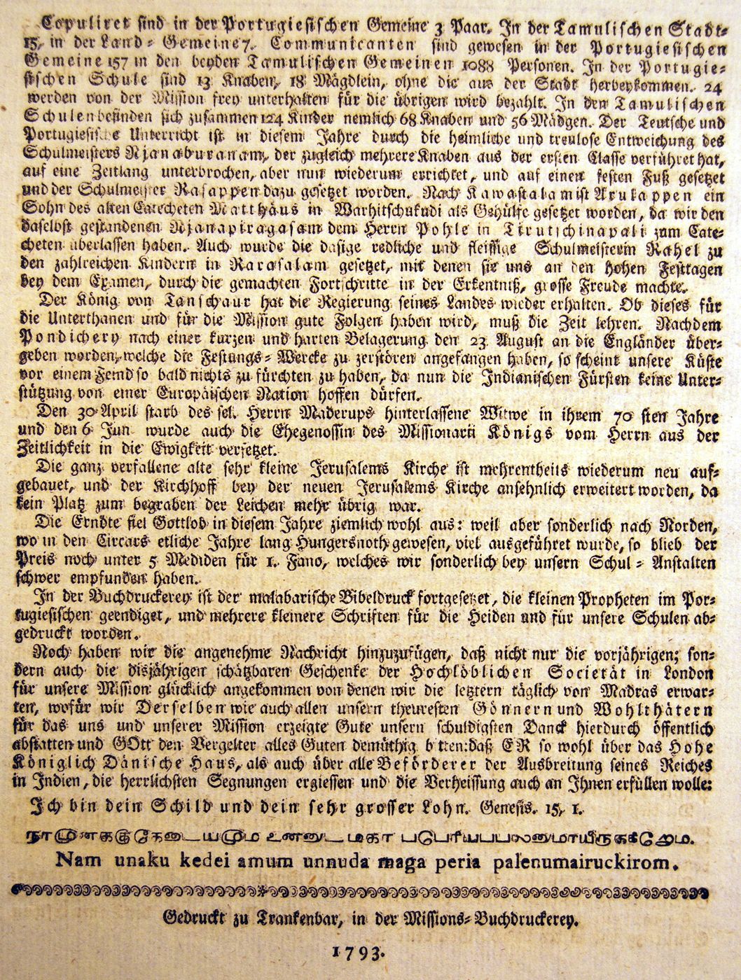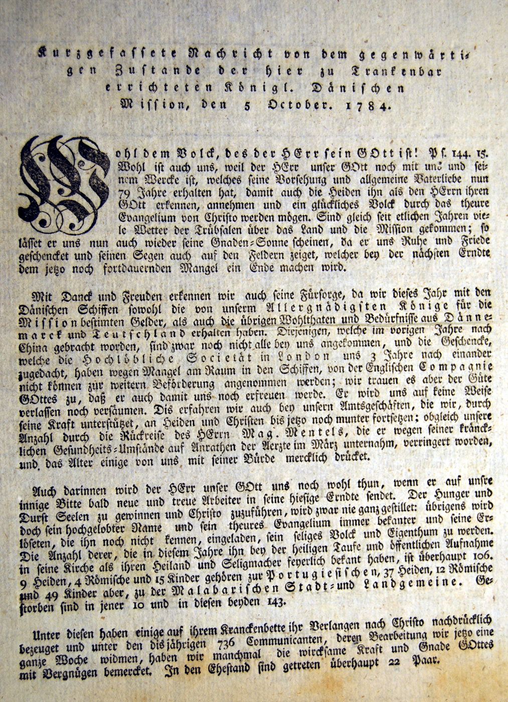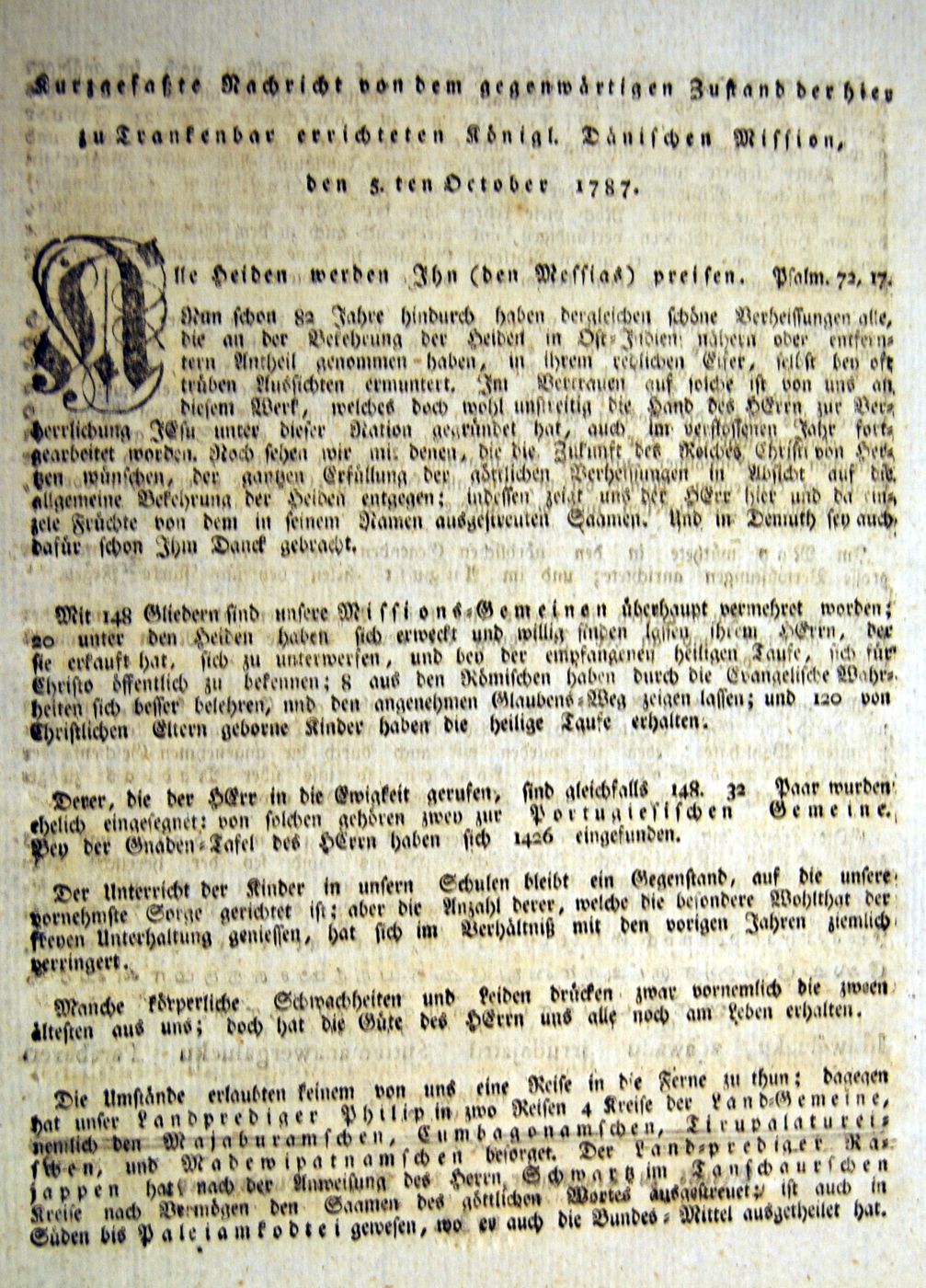 . MissionFrederik IV (1671-1730) was responsible for the evangelical missionary activity in Tranquebar. After contemplating for several years, he decided to sent evangelical messengers to Tranquebar. In 1704, he approached Dr. Lütkens about the possibility of finding suitable messengers. Lütkens, in turn, consulted Prof. Francke of Halle, Germany which resulted in two young missionaries, Bartholomäus Ziegenbalg and Heinrich Plütschau arriving at Tranquebar in 1706. Several missionaries from Germany at the behest of the Halle Mission during the next decades. They included people such as Gründler, Schultze, Schwartz, Gericke, John and Cämmerer. The history of the Tranquebar Mission has been elaborately chronicled by Ferd. Fenger ("History of the Tranquebar Mission", printed by Evangelical Lutheran Mission press, available as a Google book: books.google.dk). Other important works in this area include "Bartholomaus Ziegenbalg: the father of modern Protestant mission" and "Inkulturation in Tranquebar: Der Beitrag der fruhen Danisch-Halleschen Mission zum Werden einer Indisch-Einheimnischen Kirche (1706-1730)" by Daniel Jeyaraj. There are also several articles and book-chapters by Heike Liebau. Printed Mission reports in Gothic German covering the period 1751-1796 from the National Archives, Copenhagen as well as a few letters in Tamil by Aaron and Diogo are shown in this page. |