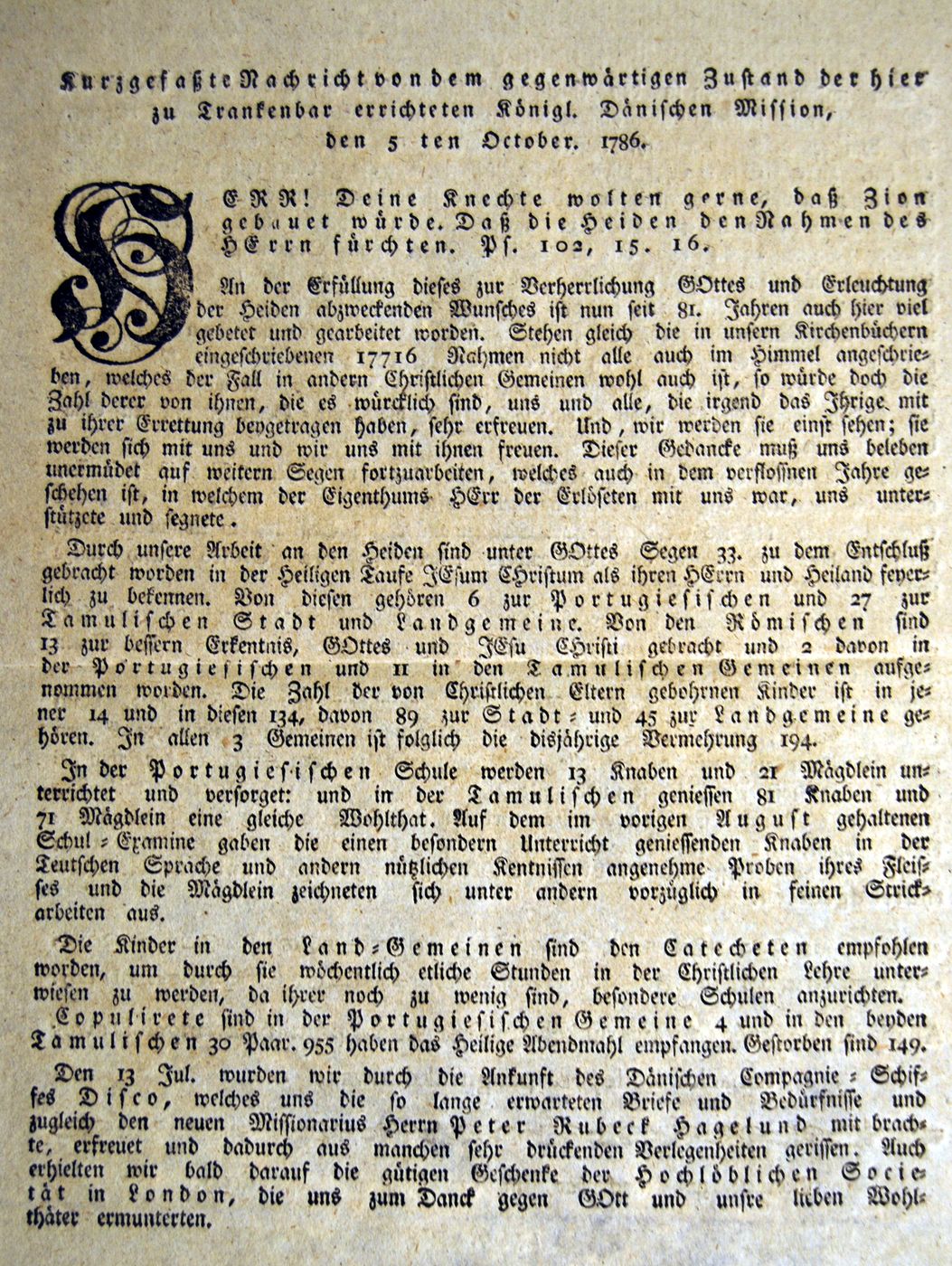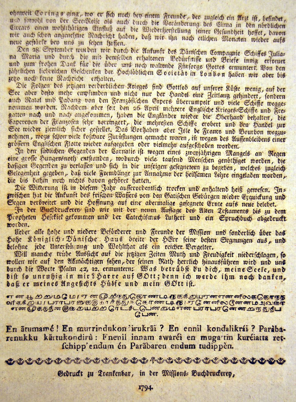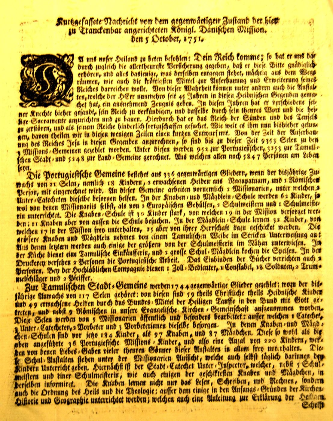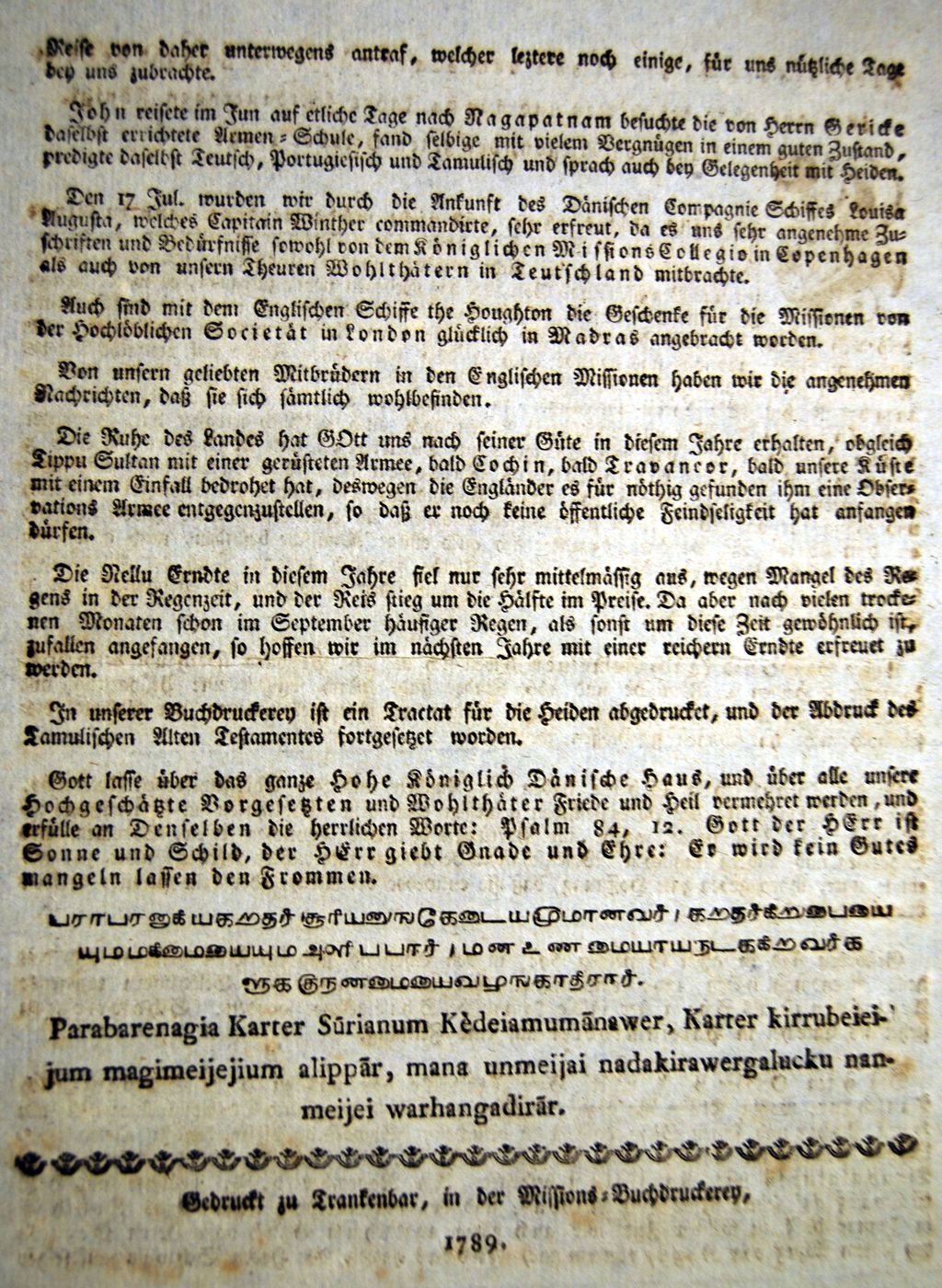 . MissionFrederik IV (1671-1730) was responsible for the evangelical missionary activity in Tranquebar. After contemplating for several years, he decided to sent evangelical messengers to Tranquebar. In 1704, he approached Dr. Lütkens about the possibility of finding suitable messengers. Lütkens, in turn, consulted Prof. Francke of Halle, Germany which resulted in two young missionaries, Bartholomäus Ziegenbalg and Heinrich Plütschau arriving at Tranquebar in 1706. Several missionaries from Germany at the behest of the Halle Mission during the next decades. They included people such as Gründler, Schultze, Schwartz, Gericke, John and Cämmerer. The history of the Tranquebar Mission has been elaborately chronicled by Ferd. Fenger ("History of the Tranquebar Mission", printed by Evangelical Lutheran Mission press, available as a Google book: books.google.dk). Other important works in this area include "Bartholomaus Ziegenbalg: the father of modern Protestant mission" and "Inkulturation in Tranquebar: Der Beitrag der fruhen Danisch-Halleschen Mission zum Werden einer Indisch-Einheimnischen Kirche (1706-1730)" by Daniel Jeyaraj. There are also several articles and book-chapters by Heike Liebau. Printed Mission reports in Gothic German covering the period 1751-1796 from the National Archives, Copenhagen as well as a few letters in Tamil by Aaron and Diogo are shown in this page. |