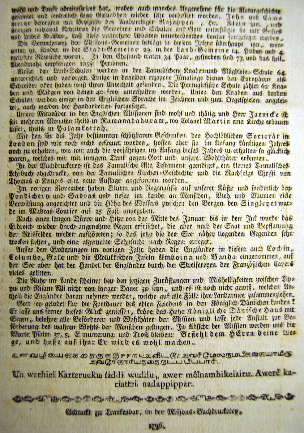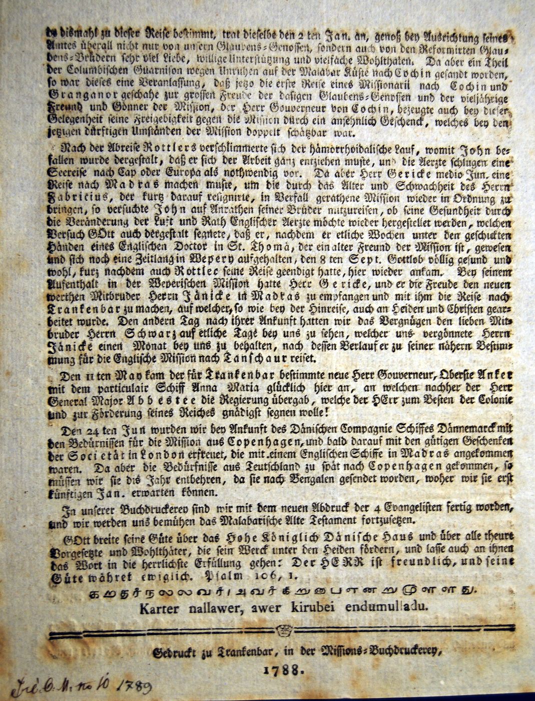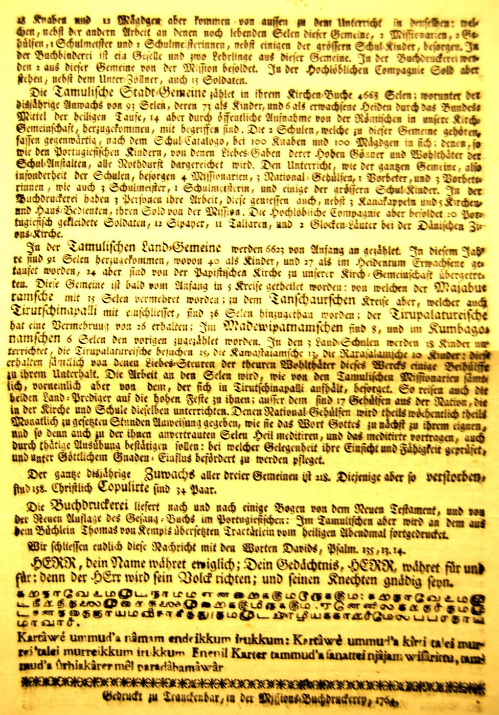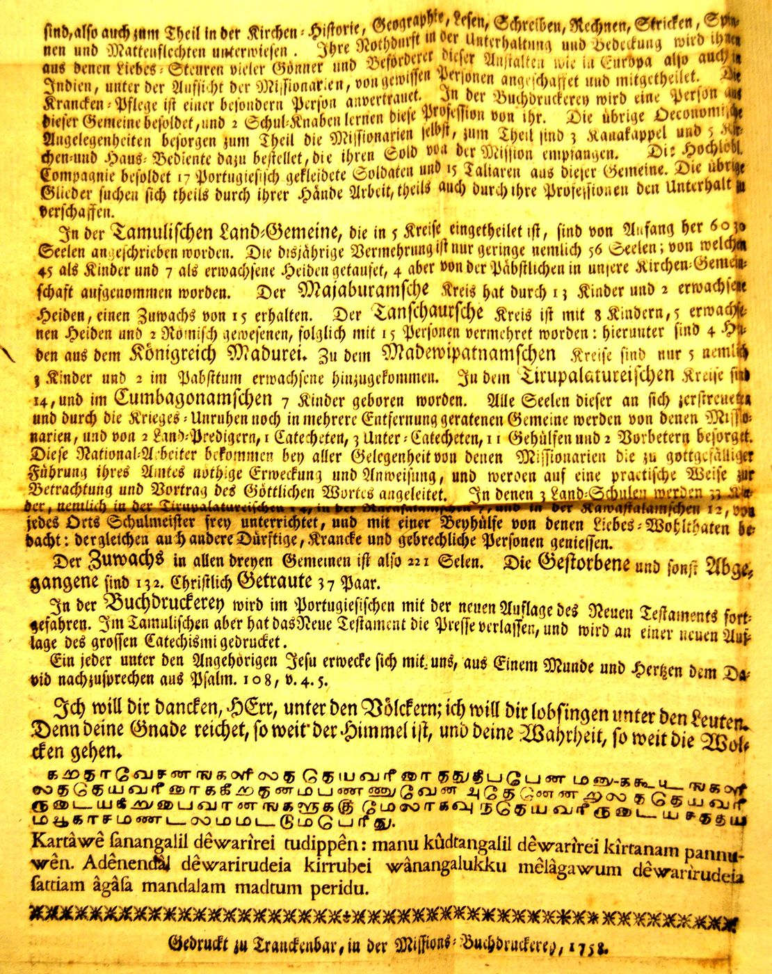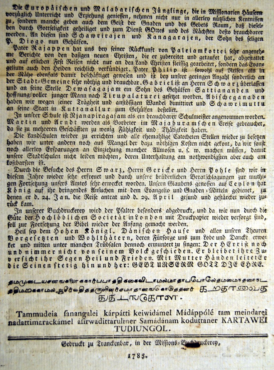 . MissionFrederik IV (1671-1730) was responsible for the evangelical missionary activity in Tranquebar. After contemplating for several years, he decided to sent evangelical messengers to Tranquebar. In 1704, he approached Dr. Lütkens about the possibility of finding suitable messengers. Lütkens, in turn, consulted Prof. Francke of Halle, Germany which resulted in two young missionaries, Bartholomäus Ziegenbalg and Heinrich Plütschau arriving at Tranquebar in 1706. Several missionaries from Germany at the behest of the Halle Mission during the next decades. They included people such as Gründler, Schultze, Schwartz, Gericke, John and Cämmerer. The history of the Tranquebar Mission has been elaborately chronicled by Ferd. Fenger ("History of the Tranquebar Mission", printed by Evangelical Lutheran Mission press, available as a Google book: books.google.dk). Other important works in this area include "Bartholomaus Ziegenbalg: the father of modern Protestant mission" and "Inkulturation in Tranquebar: Der Beitrag der fruhen Danisch-Halleschen Mission zum Werden einer Indisch-Einheimnischen Kirche (1706-1730)" by Daniel Jeyaraj. There are also several articles and book-chapters by Heike Liebau. Printed Mission reports in Gothic German covering the period 1751-1796 from the National Archives, Copenhagen as well as a few letters in Tamil by Aaron and Diogo are shown in this page. |