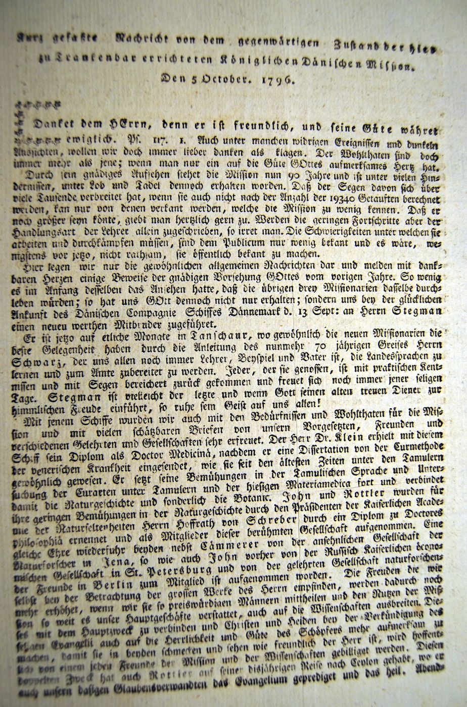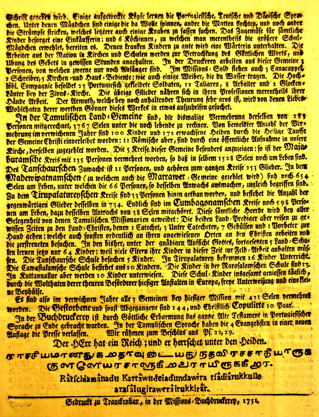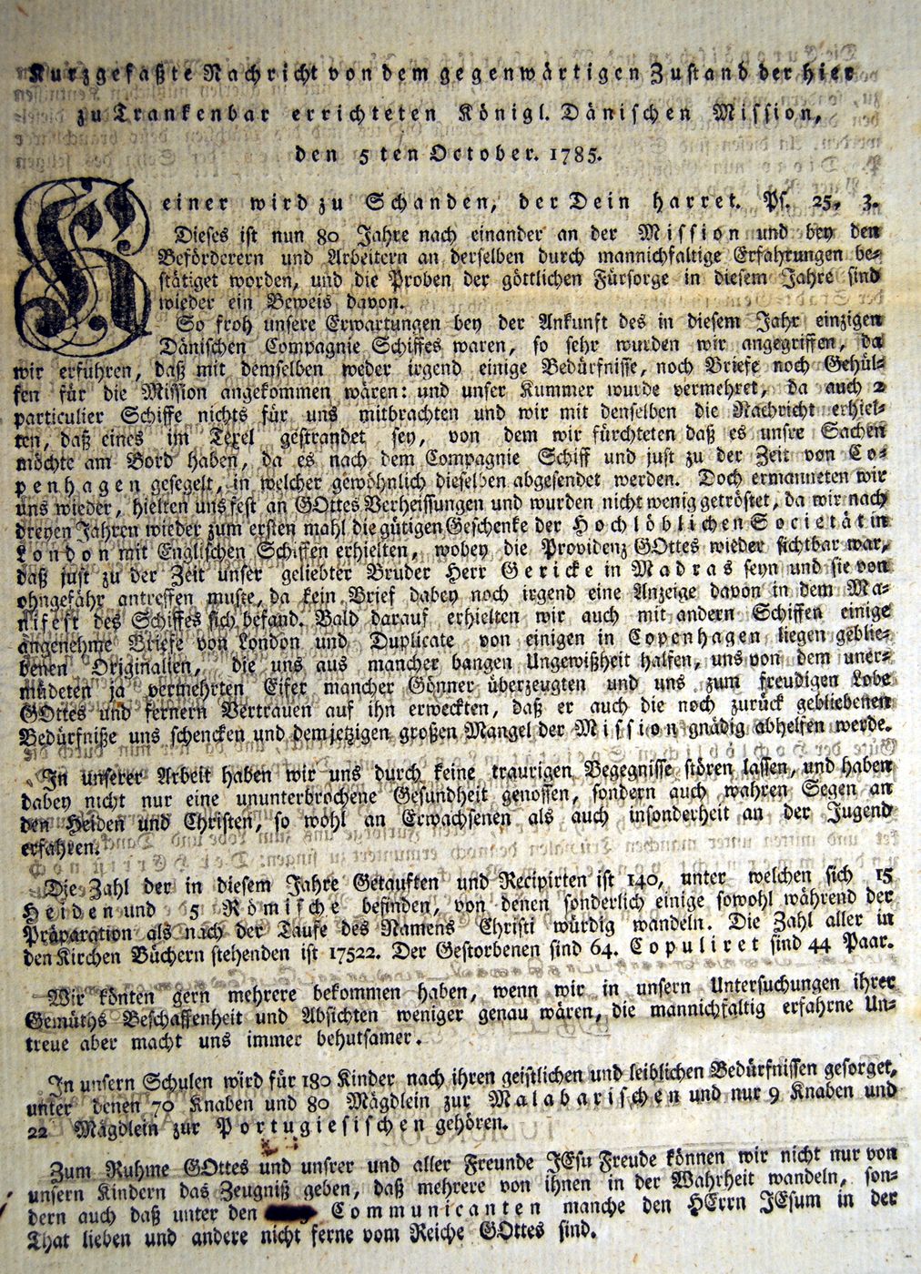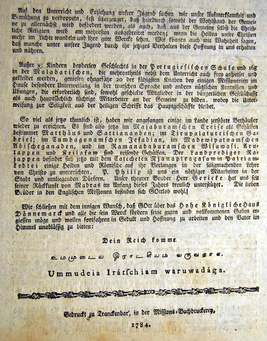 . MissionFrederik IV (1671-1730) was responsible for the evangelical missionary activity in Tranquebar. After contemplating for several years, he decided to sent evangelical messengers to Tranquebar. In 1704, he approached Dr. Lütkens about the possibility of finding suitable messengers. Lütkens, in turn, consulted Prof. Francke of Halle, Germany which resulted in two young missionaries, Bartholomäus Ziegenbalg and Heinrich Plütschau arriving at Tranquebar in 1706. Several missionaries from Germany at the behest of the Halle Mission during the next decades. They included people such as Gründler, Schultze, Schwartz, Gericke, John and Cämmerer. The history of the Tranquebar Mission has been elaborately chronicled by Ferd. Fenger ("History of the Tranquebar Mission", printed by Evangelical Lutheran Mission press, available as a Google book: books.google.dk). Other important works in this area include "Bartholomaus Ziegenbalg: the father of modern Protestant mission" and "Inkulturation in Tranquebar: Der Beitrag der fruhen Danisch-Halleschen Mission zum Werden einer Indisch-Einheimnischen Kirche (1706-1730)" by Daniel Jeyaraj. There are also several articles and book-chapters by Heike Liebau. Printed Mission reports in Gothic German covering the period 1751-1796 from the National Archives, Copenhagen as well as a few letters in Tamil by Aaron and Diogo are shown in this page. |