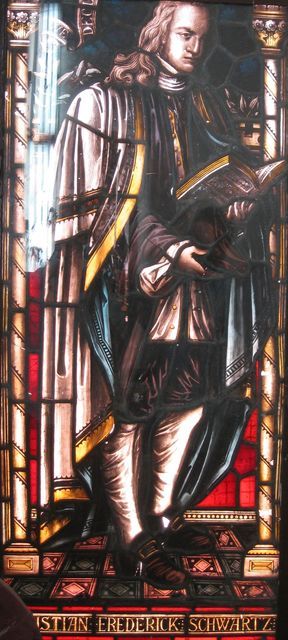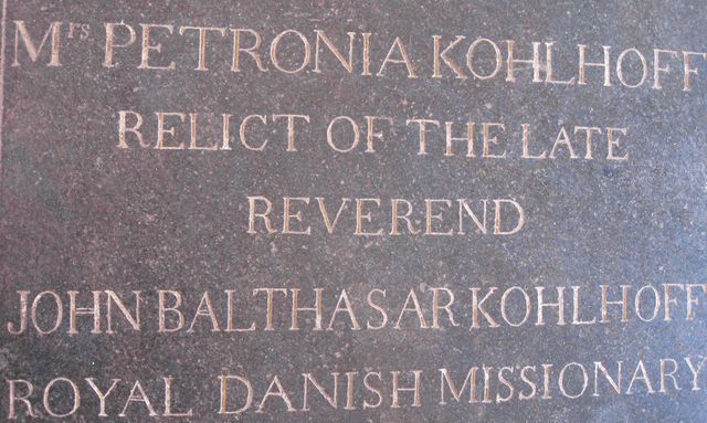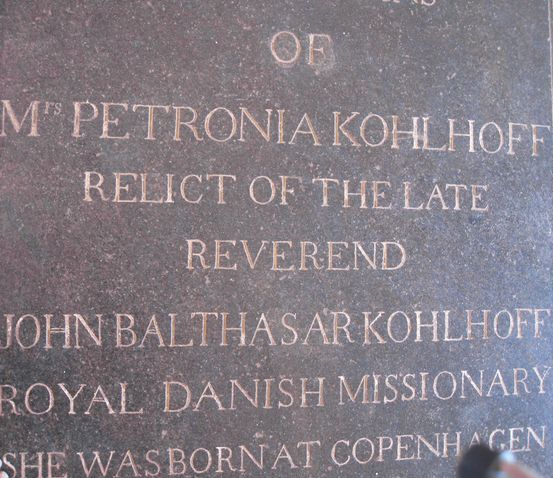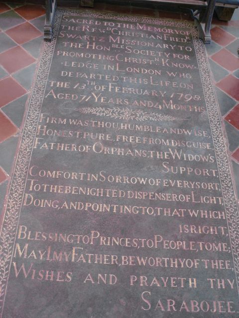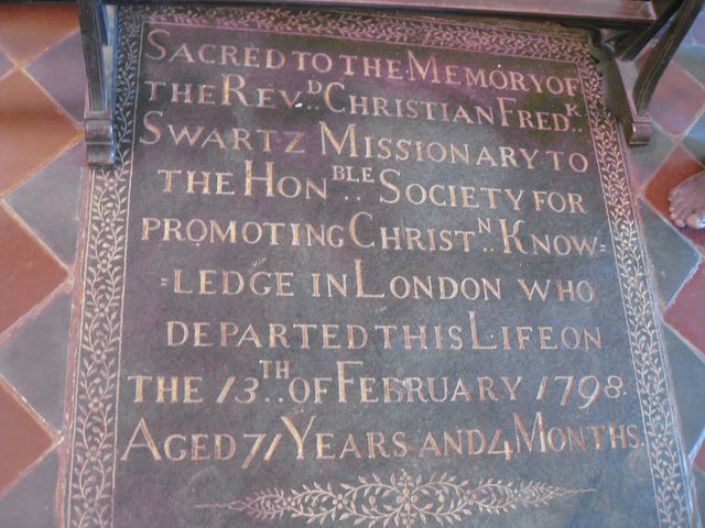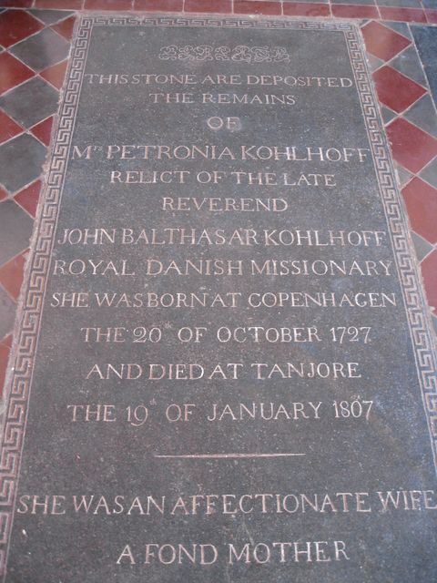 TanjoreThe city of Tanjore (Thanjavur) needs no introduction. One of th most famous temples built in South India during the 11th Centruy by the Chola King, Rajarajan, can be found in this city. A fort which contained the entire city in the old days, can still be seen.Not far from the fort, in Sivagangai Gardens, is a church devoted to Christian Frederik Schwartz. Schwartz was a Missionary sent from the city of Halle. Being sympathetic and impartial, he towered above the above Missionaries. Before Tulsaji (Tuljaji), the Maratta King of Tanjore died, he called upon Schwartz to take care of his adopted son, who was to become Serfoji II. Serfoji valued the advice of Schwartz throughout his life. When Schwartz died, Serfoji attended the funeral. Later, he built a Church to honor the memory of Schwartz, and established a magnificient marble memorial in the Church. Schwartz himself is buried in St. Peter's Church on Mission Street in Tanjore. The chair used by Schwartz can still be seen in the Church. There are also magnificient painted glass windows portraying Schwartz. Along with Schwartz, the Missionary John Balthazar Kohlhoff's wife, Petronella (Petronia) Kohlhoff, his son John Caspar Kohlhoff are also buried. Just beside the church, there are two magnificient and dilapidated buildings can be seen. One of them is probably the house where Schwarz had lived, and the other, a beautiful cathedral in need of minor repairs. It is a pity that these important historical buildings are in such a bad condition. . |